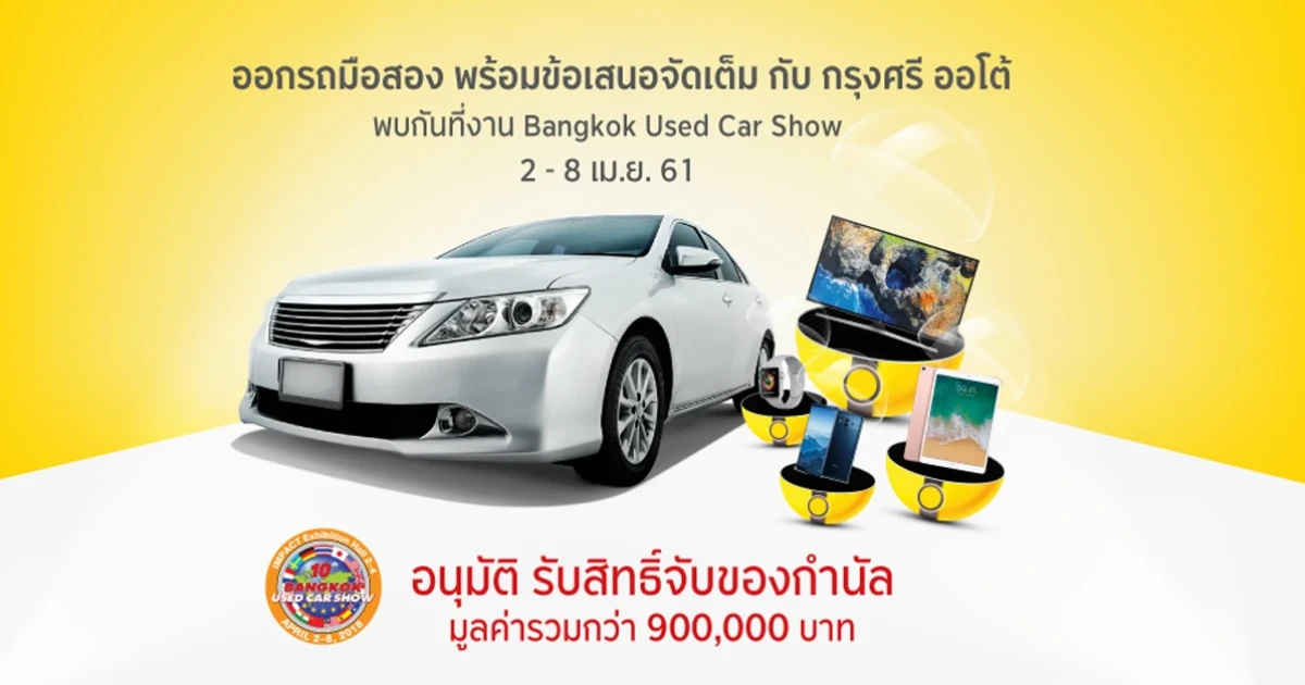 พบกรุงศรี ออโต้ ที่งาน Bangkok Used Car Show ออกรถมือสอง อนุมัติ รับสิทธิ์จับของกำนัล มูลค่ารวมกว่า 900,000 บาท บูธ กรุงศรี ออโต้ เอ็กซิบิชั่น ฮอลล์ 2 - 4 เมืองทองธานี วันที่ 2 - 8 เม.ย. 61 เวลา 12.00 - 22.00 น.