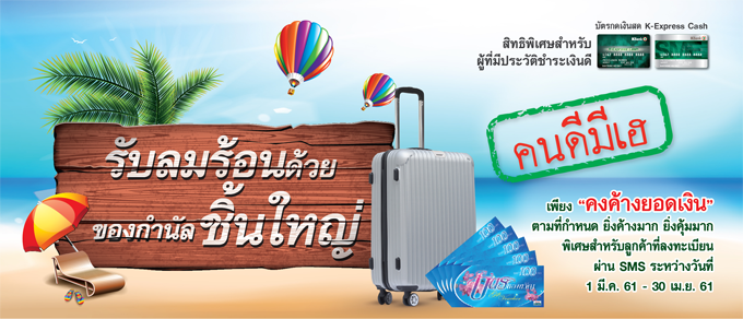 - ธนาคารขอสงวนสิทธิมอบของกำนัลที่มีมูลค่าสูงสุดเพียง 1 รางวัล กรณีที่ลูกค้าเข้าร่วมกิจกรรมส่งเสริมการขายมากกว่า 1 รายการขึ้นไป โดยมีรายละเอียดของกำนัลดังนี้ รับกระเป๋าล้อลาก 26 นิ้ว มูลค่า 5,990 บาท หรือบัตรกำนัล Tesco Lotus 800 บาท หรือ 400 บาท หรือ 100 บาท เมื่อมียอดคงค้างเพิ่มขึ้นตั้งแต่ 100,000 บาทขึ้นไป หรือตั้งแต่ 50,000 บาทขึ้นไป หรือตั้งแต่ 30,000 บาทขึ้นไป หรือตั้งแต่ 10,000 บาทขึ้นไป ตามลำดับจากใบแจ้งยอดบัญชีของเดือน ก.พ. 61 โดยมียอดคงค้างดังกล่าวระหว่าง 22 มี.ค. 61 ถึง 31 มี.ค. 61 และ ระหว่าง 21 เม.ย. 61 ถึง 30 เม.ย. 61 และได้ลงทะเบียนเข้าร่วมรายการผ่าน SMS ทางโทรศัพท์เคลื่อนที่เฉพาะ 2,200 รายแรกเท่านั้น โดยพิมพ์ KEC เว้นวรรค ตามด้วยหมายเลขบัตร K-Express Cash 12 หลักสุดท้าย ส่งมาที่ 4545888 (ครั้งละ 3 บาท) ตั้งแต่วันที่ 1 มี.ค. - 30 เม.ย. 61 และได้รับ SMS ยืนยันการเข้าร่วมรายการจากธนาคารหลังจากการลงทะเบียนแล้ว