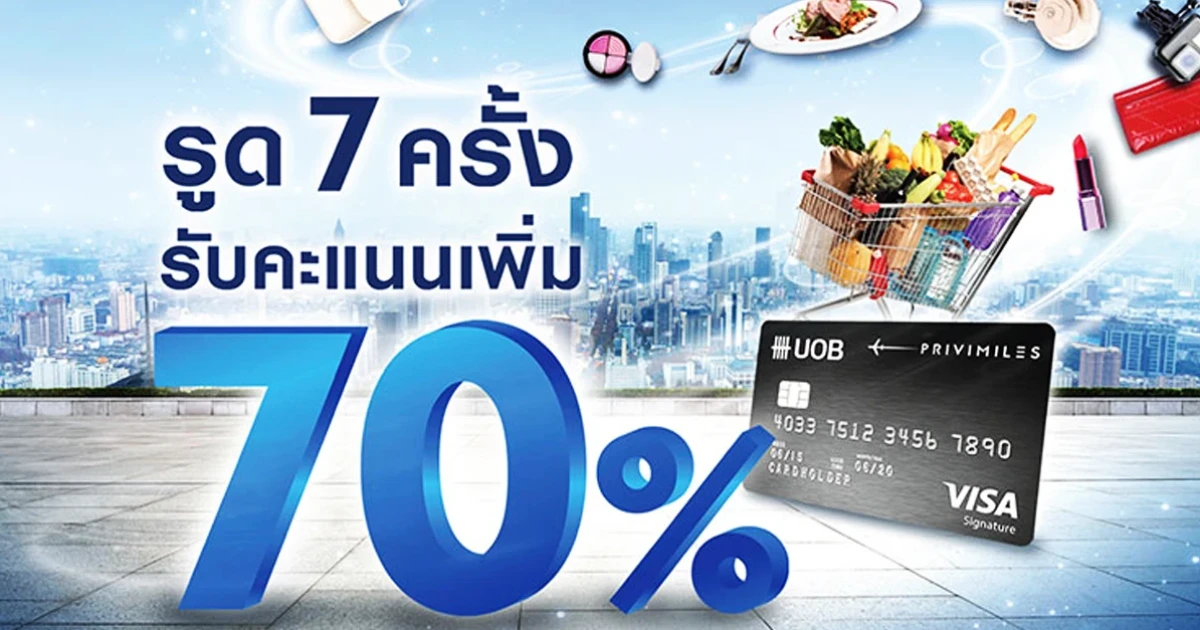 รูด 7 ครั้ง รับคะแนนสะสมเพิ่ม 70% เมื่อมียอดใช้จ่ายผ่านบัตรเครดิตยูโอบี เป็นสกุลเงินบาท ที่ไม่เกิน 50,000 บาท / เดือน