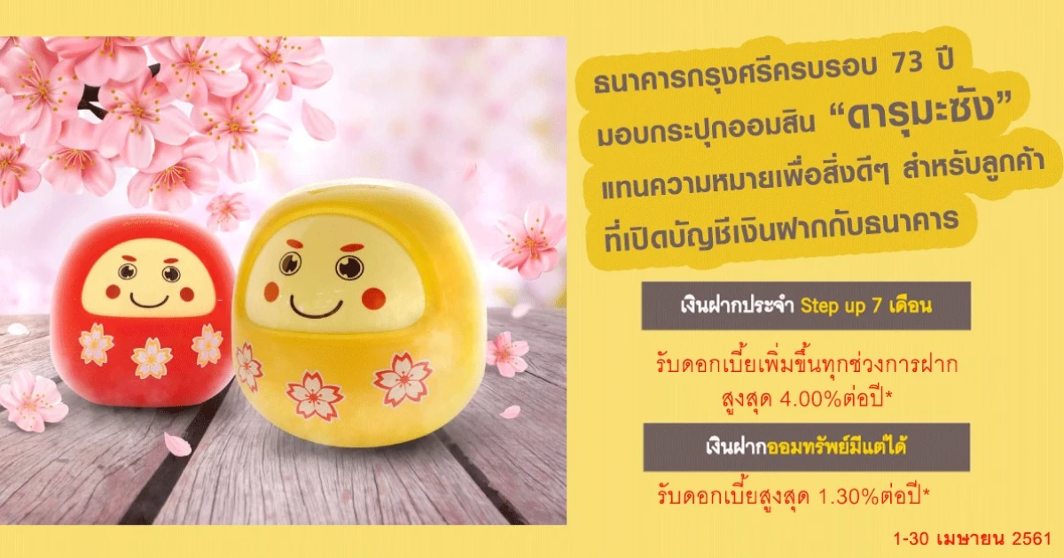 ธนาคารกรุงศรีครบรอบ 73 ปี มอบกระปุกออมสิน "ดารุมะซัง" แทนความหมายเพื่อสิ่งดีๆ สำหรับลูกค้าที่เปิดบัญชีเงินฝากประจำ Step up 7 เดือน หรือ บัญชีเงินฝากออมทรัพย์มีแต่ได้