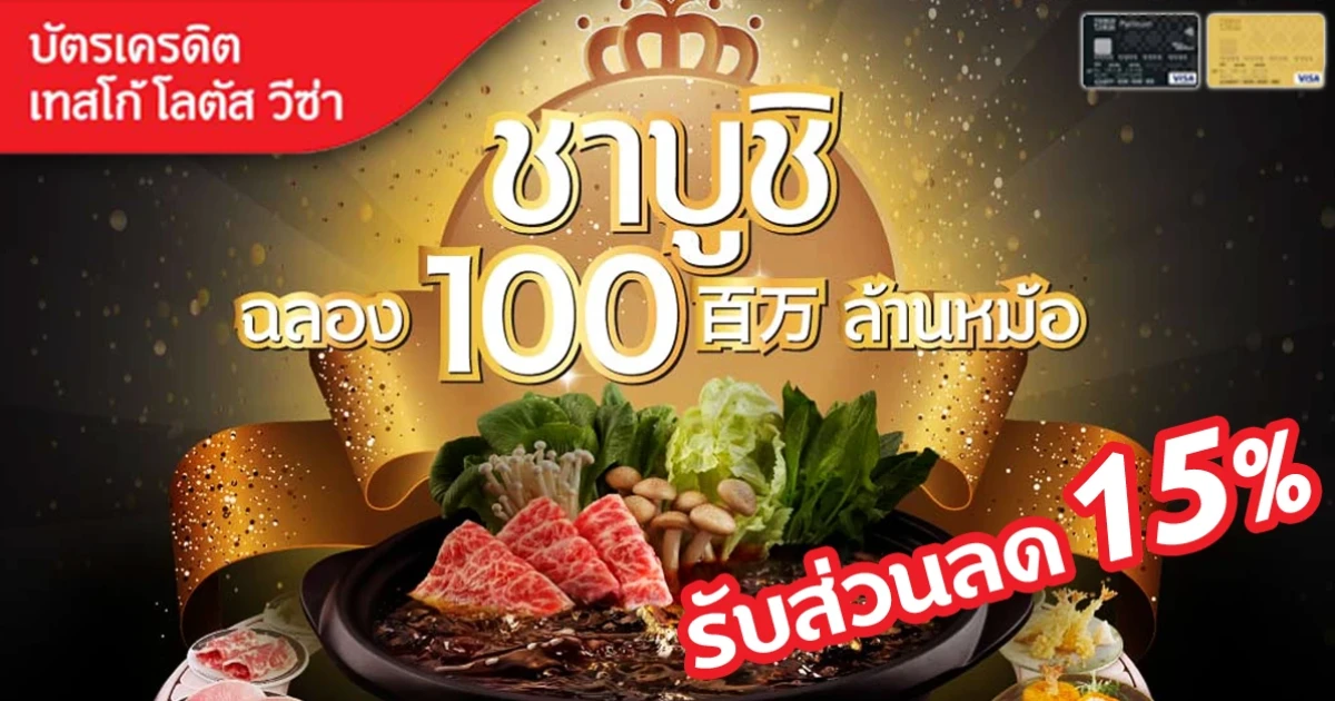 ชาบูชิ ฉลอง 100 ล้านหม้อ รับส่วนลด 15% เมื่อทานที่ร้านชาบูชิ และชำระผ่านบัตรเครดิตเทสโก้ โลตัส วีซ่า