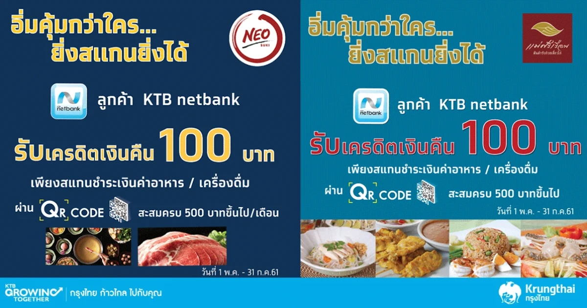 โปรโมชั่นอิ่มคุ้มจาก KTB netbank วันนี้ ! เพียงสแกนชำระค่าอาหาร/เครื่องดื่มผ่าน QR Code ด้วยแอปพลิเคชัน KTB netbank สะสมครบ 500 บาทขึ้นไป/เดือน ที่ร้าน นีโอ สกี้ และร้านแม่ศรีเรือนทุกสาขา รับเครดิตเงินคืน 100 บาท