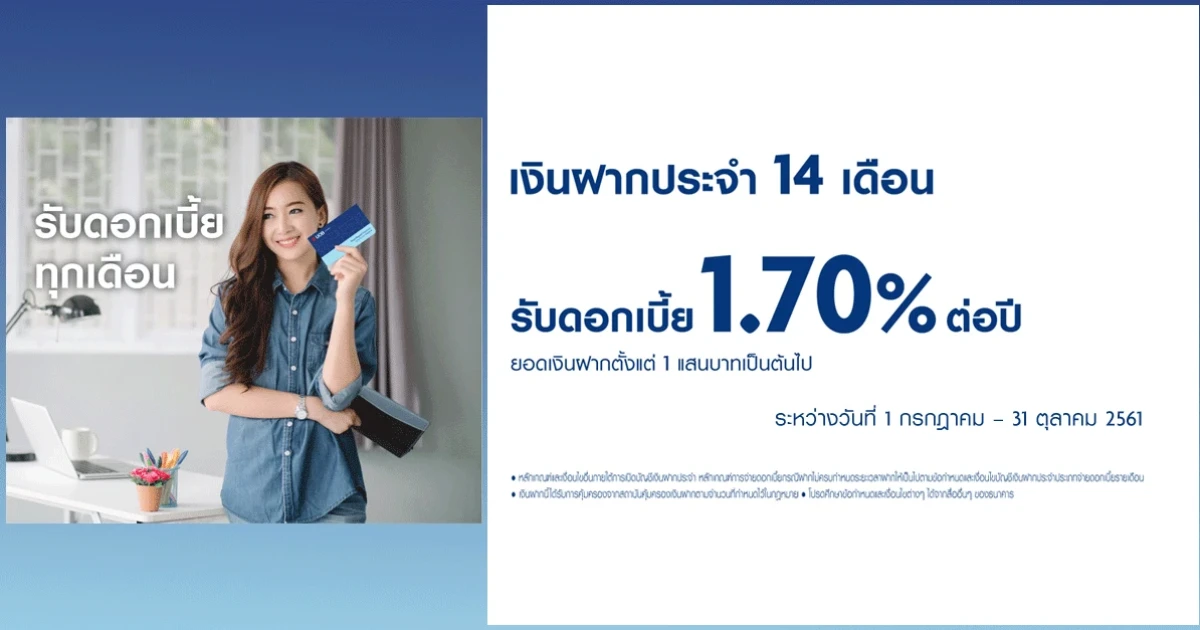- อัตราดอกเบี้ยพิเศษนี้สำหรับลูกค้าประเภทบุคคลธรรมดา ที่มาเปิดบัญชีประเภทเงินฝากประจำ ระยะเวลาฝาก 14 เดือน ด้วยยอดเงินฝากตั้งแต่ 100,000 บาท ระหว่างวันที่ 1 กรกฎาคม - 31 ตุลาคม 2561