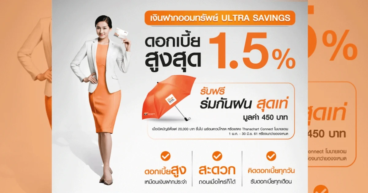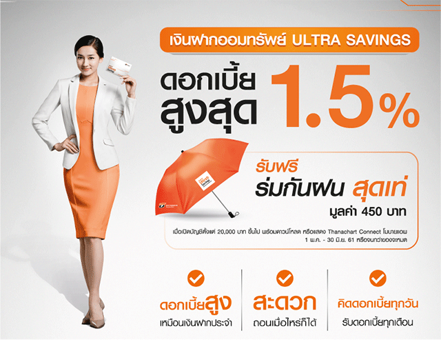 โปรโมชั่นรับหน้าฝน รับฟรี !! ร่มกันฝนสุดเท่ มูลค่า 450 บาท เพียงเปิดบัญชีเงินฝากออมทรัพย์อัลตร้าเซฟวิ่ง ตั้งแต่ 20,000 บาทขึ้นไป พร้อมดาวน์โหลด หรือแสดง Thanachart Connect โมบายแอปฯ