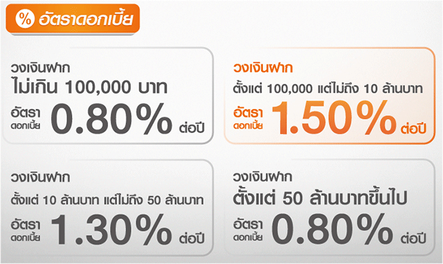 - ธนาคารคำนวณดอกเบี้ยให้ตามยอดเงินคงเหลือ ณ สิ้นวัน และสามารถเบิกถอนดอกเบี้ย ได้ทุกวันที่ 10 ของเดือน