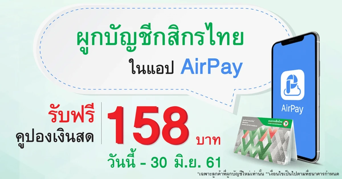 พิเศษสุดๆ ผูกบัญชีธนาคารกสิกรไทย กับแอร์เพย์ (AirPay) รับฟรีคูปองเงินสด 158 บาท * สิทธิพิเศษเฉพาะลูกค้าใหม่ สมัครง่ายๆ ได้ทันทีแบบ Real-Time ผ่าน K PLUS บนแอปฯ AirPay หรือช่องทางอื่นๆ ของธนาคาร K-ATM, และ K-Cyber