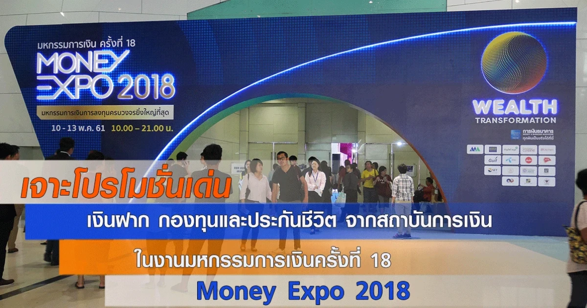 เปิดอย่างยิ่งใหญ่เป็นที่เรียบร้อยแล้วนะคะสำหรับ "งานมหกรรมการเงิน ครั้งที่ 18" Money Expo 2018 แนวคิด "Wealth Transformation มิติใหม่แห่งความมั่งคั่ง" ณ ชาเลนเจอร์ฮอลล์ 2-3 อิมแพ็ค เมืองทองธานี โดยงานจัดขึ้นระหว่างวันที่ 10 - 13 พฤษภาคม 2561 และก็เช่นเคยค่ะที่ทีมงานเช็คราคา.คอม ก็ไม่พลาดที่จะนำภาพบรรยากาศบูธธนาคาร รวมถึงจะพาไปเจาะโปรโมชั่นเด่น เน้นกันในเรื่องเงินฝาก กองทุน และประกันชีวิต มาให้ผู้ที่สนใจได้เลือกสรรกันเลยนะคะ อยากรู้ว่าธนาคารไหนมีอะไรเด็ดๆ โดนๆ บ้าง ตามมาดูพร้อมกันเลยค่ะ