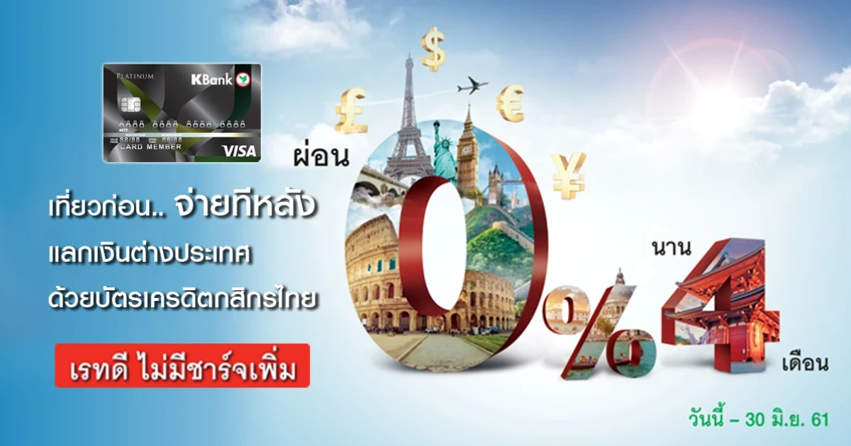 เที่ยวก่อน.. จ่ายทีหลัง ผ่อน 0% นาน 4 เดือน แลกเงินต่างประเทศ เรทดี ไม่มีชาร์จ จากบัตรเครดิตกสิกรไทย