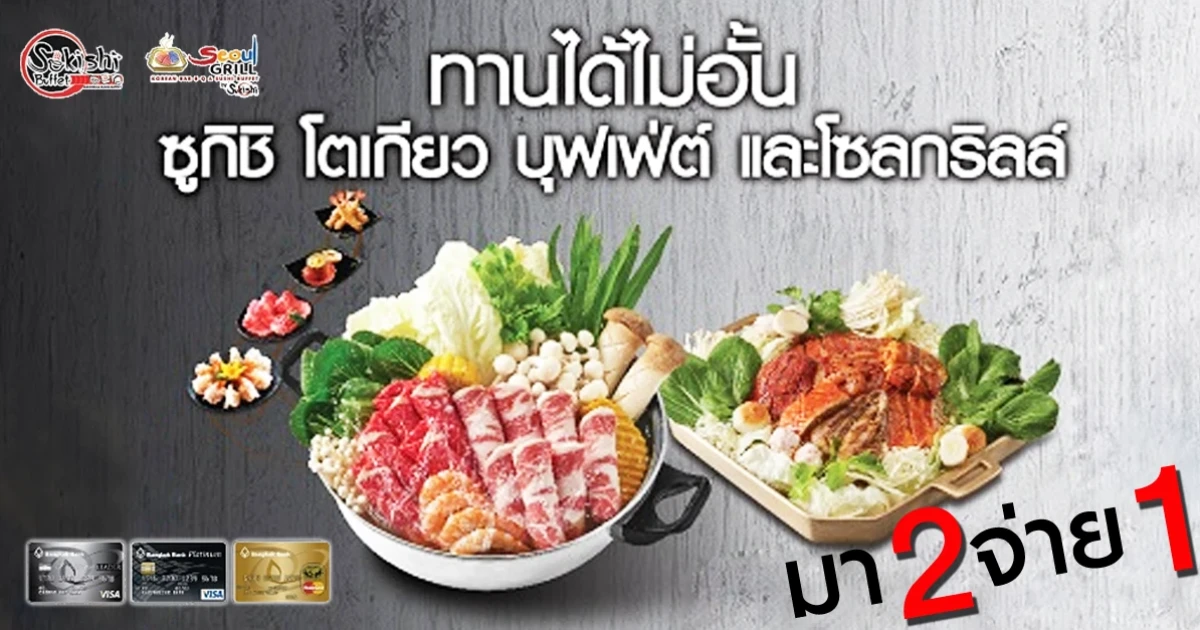 มา 2 จ่าย 1 ทานได้ไม่อั้น ที่ซูกิชิ โตเกียว บุฟเฟ่ต์ และโซลกริลล์ เมื่อจ่ายผ่านบัตรเครดิตธนาคารกรุงเทพ