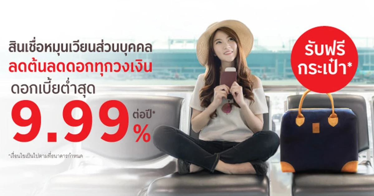 สินเชื่อหมุนเวียนส่วนบุคคล ลดต้นลดดอกทุกวงเงิน ดอกเบี้ยต่ำสุด 9.99% ต่อปี พร้อมรับฟรี! กระเป๋า