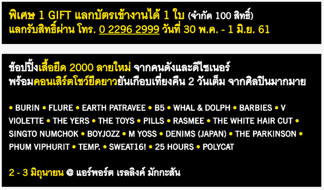 - แลกรับสิทธิ์ผ่าน Krungsri GIFT Hot Line โทร. 02-296-2999 ได้ตั้งแต่วันที่ 30 พ.ค. - 1 มิ.ย. 61 เวลา 9.30 - 16.30 น. ยกเว้นวันหยุดนักขัตฤกษ์ และติดต่อเพื่อรับบัตรเข้างาน ที่บูธธนาคารกรุงศรี พร้อมแสดงบัตรประชาชนเพื่อเป็นหลักฐานในการรับบัตรเข้างาน ในวันที่ 2 - 3 มิ.ย. 61 เวลา 11.00 - 15.00 น.