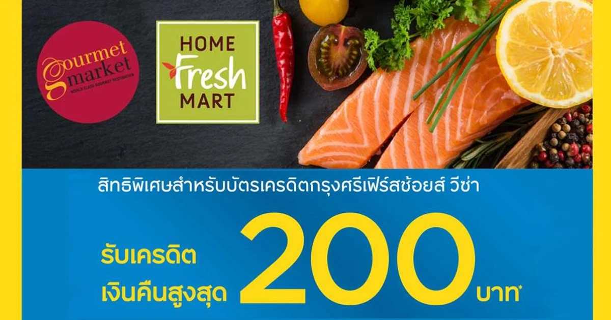 รับคืนสูงสุด 200.- เมื่อใช้จ่ายที่ Gourmet market และ Home Fresh Mart ผ่านฯ กรุงศรีเฟิร์สช้อยส์ วีซ่า