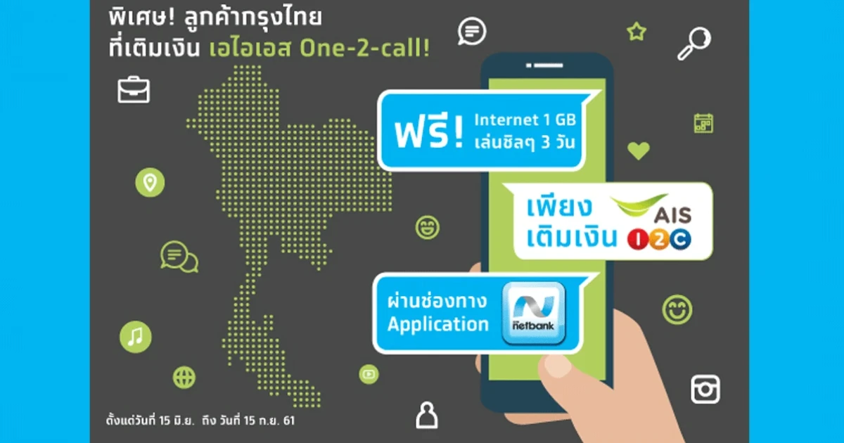 ลูกค้ากรุงไทยที่เติมเงิน เอไอเอส One-2-call ผ่านช่องทาง KTB netbank รับฟรี! Internet 1 GB เล่นชิลๆ 3 วัน