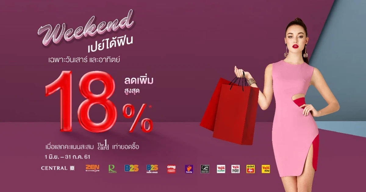 Weekend เปย์ได้ฟิน! ลดเพิ่มสูงสุด 18% เมื่อช้อปทุกวันเสาร์ - อาทิตย์ ณ ร้านค้าในเครือ Central Group ที่ร่วมรายการ ผ่านบัตรเครดิตเซ็นทรัล เดอะวัน