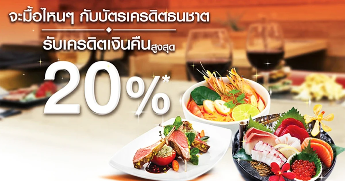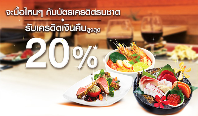 จะมื้อไหนๆ ก็รับเครดิตเงินคืนสูงสุด 20% เมื่อทานอาหาร ณ ร้านอาหารชั้นนำที่ร่วมรายการ ภายในประเทศ และชำระผ่านบัตรเครดิตธนชาต