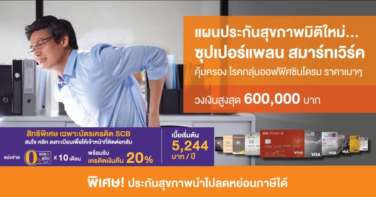 แผนประกันสุขภาพมิติใหม่ "ซูเปอร์แพลน สมาร์ทเวิร์ค" คุ้มครองโรคกลุ่มออฟฟิศซินโดรม ในราคาเบาๆ วงเงินสูงสุด 600,000 บาท เบี้ยประกันเริ่มต้นเพียง 5,244 บาท/ปี และค่าเบี้ยประกันสุขภาพยังสามารถนำไปลดหย่อนภาษีได้อีกด้วย