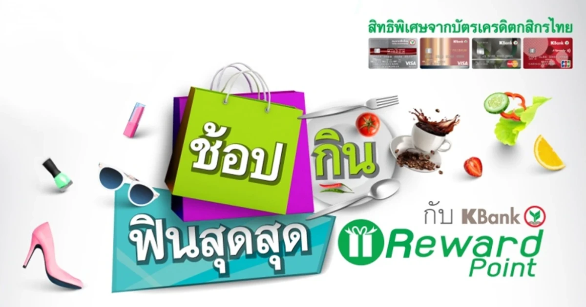ช้อป กิน ฟินสุดสุด กับ KBank Reward Point แลกรับเป็นบัตรกำนัลร้านอาหาร และเครื่องดื่ม ที่ร่วมรายการ หรือแลกรับเป็นเงินคืนเพื่อลดค่าใช้จ่ายบัตรเครดิต