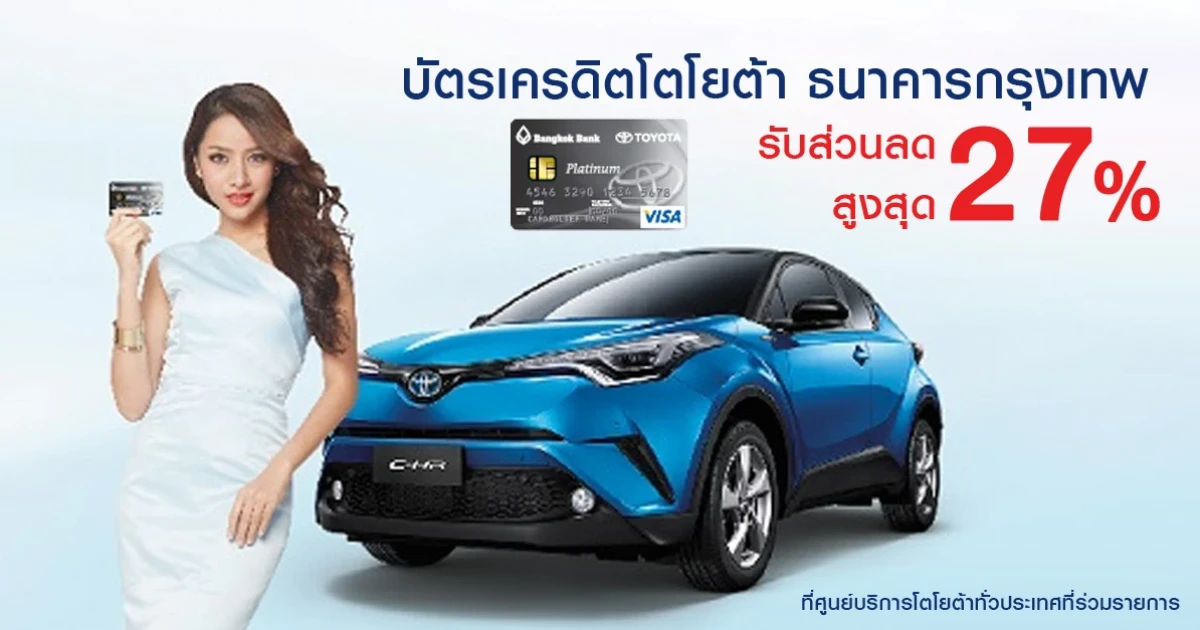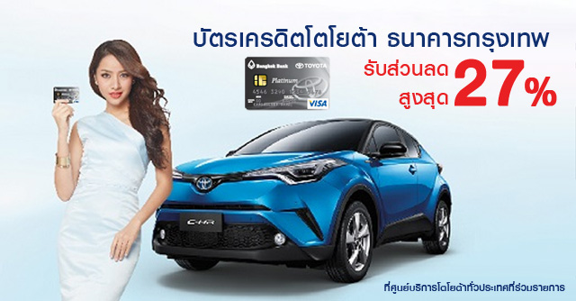 รับส่วนลดสูงสุด 27% ที่ศูนย์บริการโตโยต้าทั่วประเทศที่ร่วมรายการ จากบัตรเครดิตโตโยต้า ธนาคารกรุงเทพ