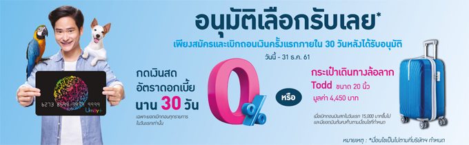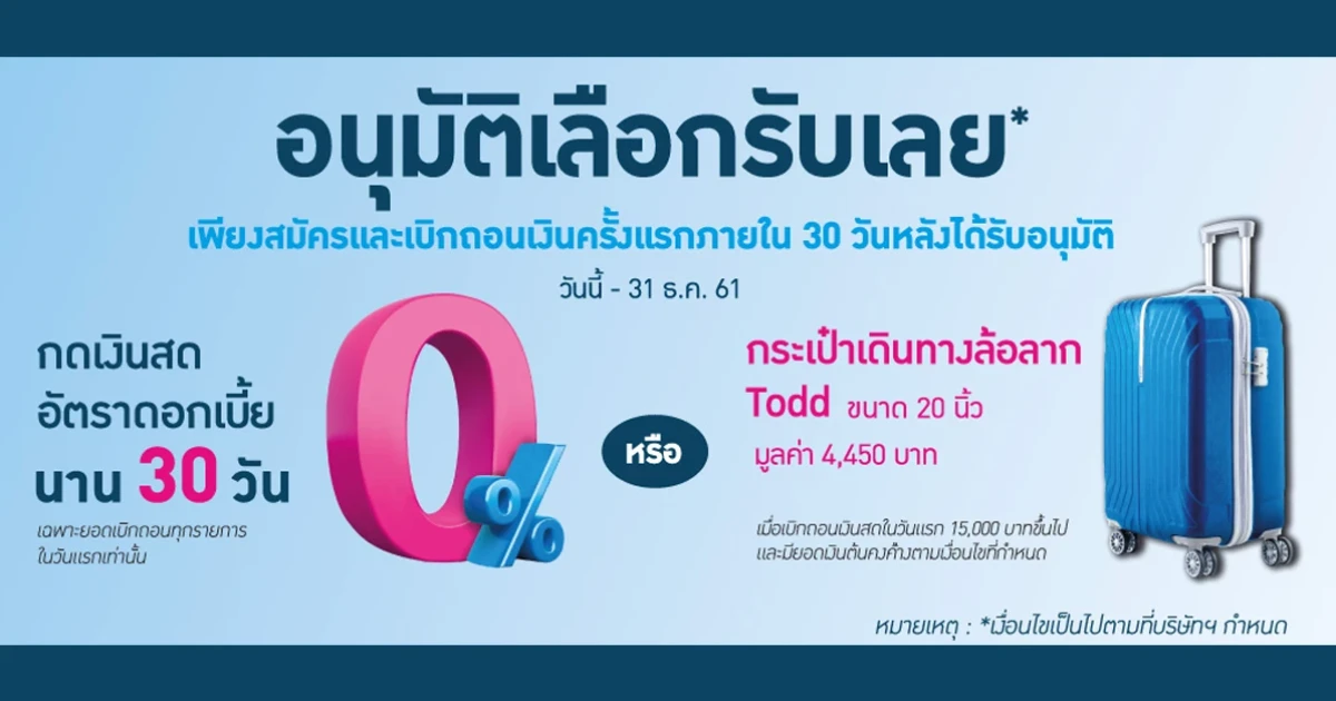 อนุมัติเลือกรับเลย ดอกเบี้ย 0% นาน 30 วัน หรือรับกระเป๋าล้อลาก Todd เพียงสมัครบัตรกดเงินสดยูเมะพลัส