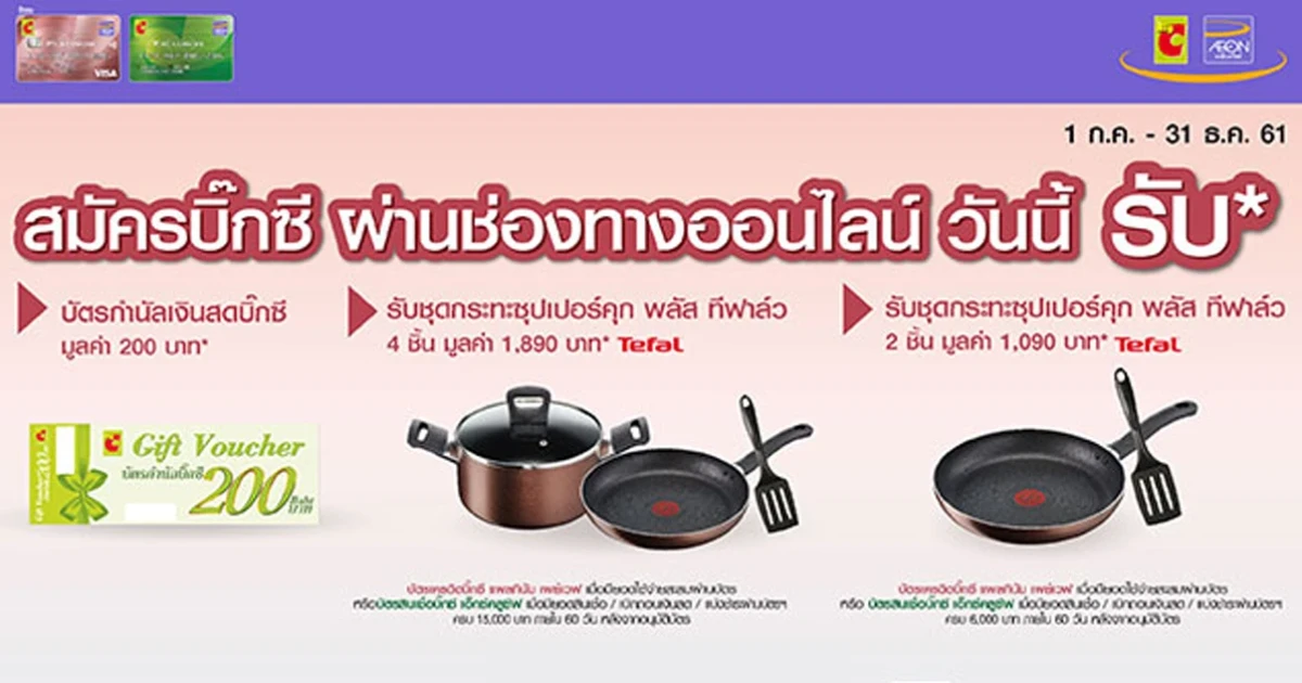 - ลูกค้าที่สมัครบัตรสมาชิก สินเชื่อ บิ๊กซี เอ็กซ์คูลซีฟ ผ่านช่องทางออนไลน์ ระหว่างวันที่ 1 กรกฎาคม - 31 ธันวาคม 2561 ฟรีค่าธรรมเนียมรายปีตลอดชีพ เฉพาะลูกค้าที่สมัครบัตรบิ๊กซี ผ่านช่องทางออนไลน์ ไม่รวมถึงการสมัคร ผ่านช่องทางออนไลน์ โดยผ่านคอมพิวเตอร์ของสาขา - รับ Gift Voucher Big C สูงสุดมูลค่า 200 บาท
