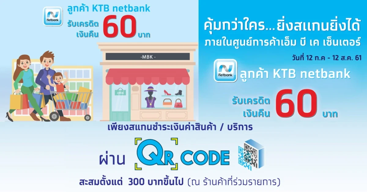 ลูกค้า KTB netbank รับเครดิตเงินคืน 60 บาท เพียงสแกนชำระเงินค่าสินค้า / บริการ ผ่าน QR Code ภายในศูนย์การค้าเอ็ม บี เค เซ็นเตอร์ สะสมตั้งแต่ 300 บาทขึ้นไป (ณ ร้านค้าที่ร่วมรายการ)