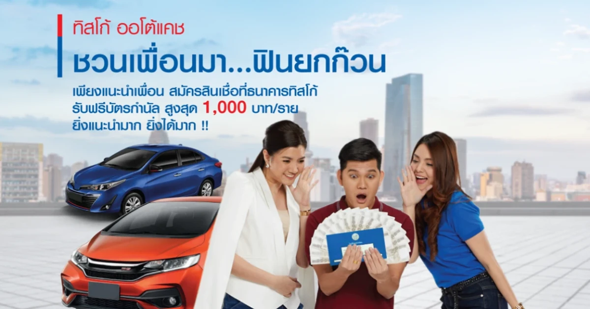 ทิสโก้ ออโต้แคช ชวนเพื่อนมา...ฟินยกก๊วน เพียงแนะนำเพื่อน สมัครสินเชื่อที่ธนาคารทิสโก้ รับฟรี! บัตรกำนัล สูงสุด 1,000 บาท/ราย ยิ่งแนะนำมาก ยิ่งได้มาก!!