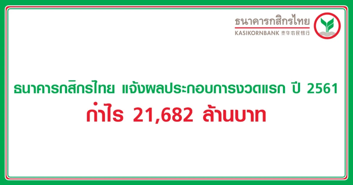ธนาคารกสิกรไทย แจ้งผลประกอบการงวดแรก ปี 2561 กำไร 21,682 ล้านบาท