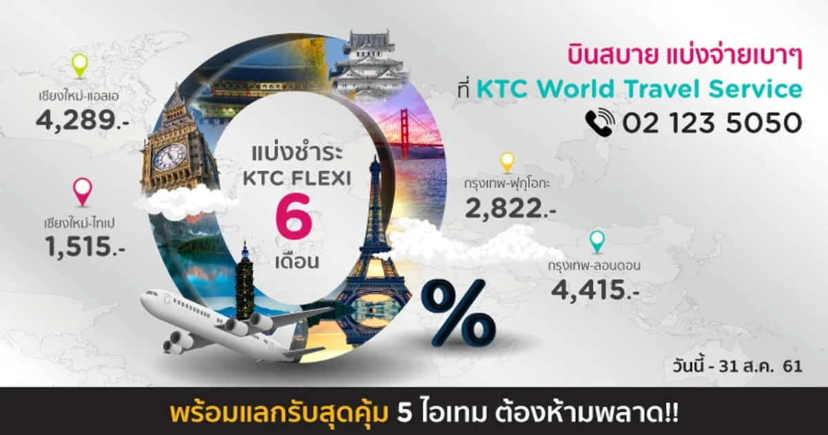 บินสบาย แบ่งจ่ายเบาๆ 0% นานสูงสุด 6 เดือน พร้อมแลกรับง่ายๆ 5 ไอเทมเพื่อการเดินทาง ที่ KTC World Travel Service โทร 02-123-5050 สิทธิพิเศษสำหรับสมาชิกบัตรเครดิต KTC