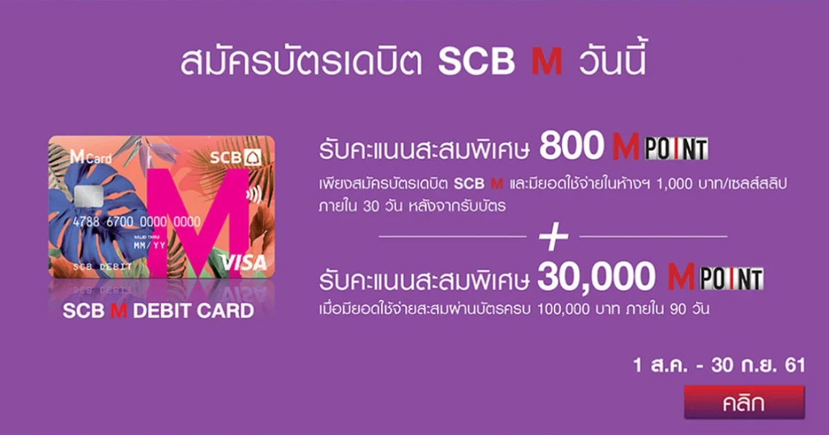 สมัครบัตรเดบิต SCB M วันนี้ รับคะแนนสะสมพิเศษสูงสุด 30,000 M POINT เมื่อมียอดใช้จ่ายสะสมผ่านบัตรฯ
