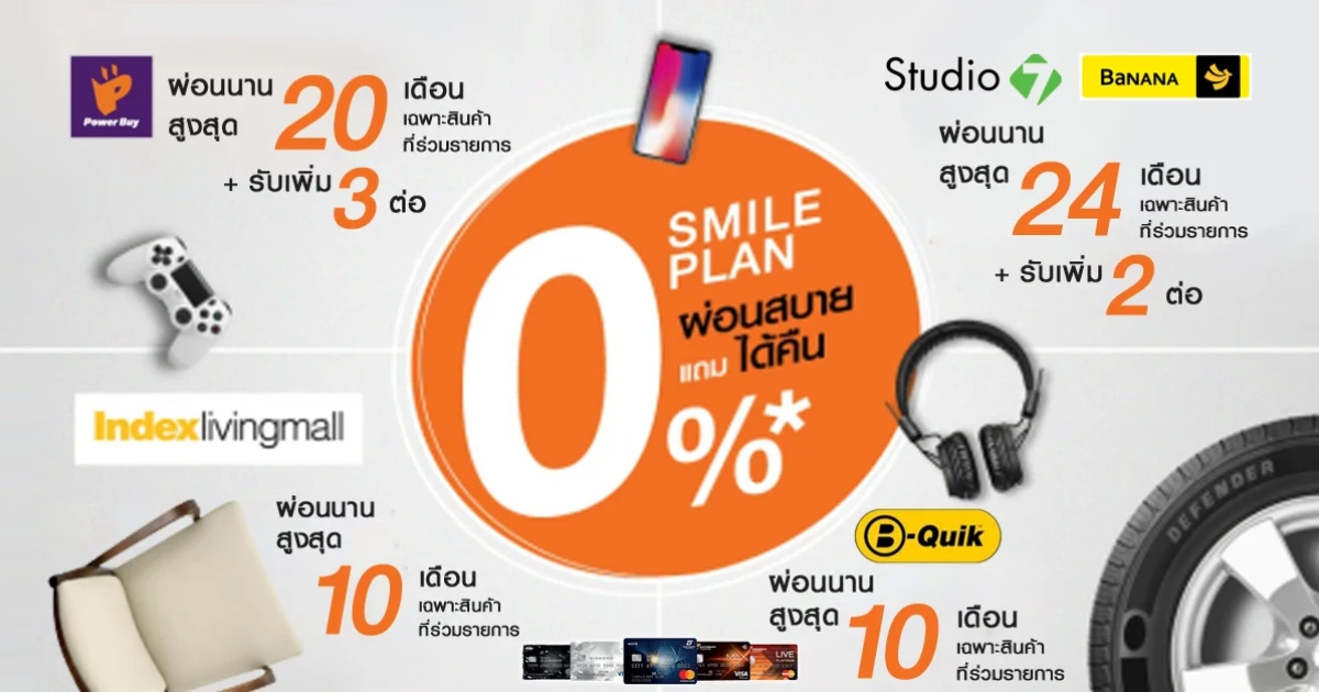 0% Smile Plan ผ่อนสบาย แถมได้คืน ณ ร้านค้าที่ร่วมรายการ อาทิ Power Buy, Studio 7 / BaNANA IT, Index Living Mall และ B-Quik สิทธิพิเศษจากบัตรเครดิตธนชาต