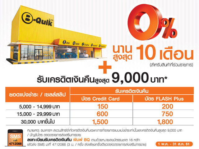 รายละเอียดโปรโมชั่น : ผ่อนชำระ 0% นานสูงสุด 10 เดือน พร้อมรับเครดิตเงินคืนสูงสุด 9,000 บาท เมื่อมียอดผ่อนชำระตั้งแต่ 5,000 บาทขึ้นไป/ เซลล์สลิป ที่ร้าน B-Quik