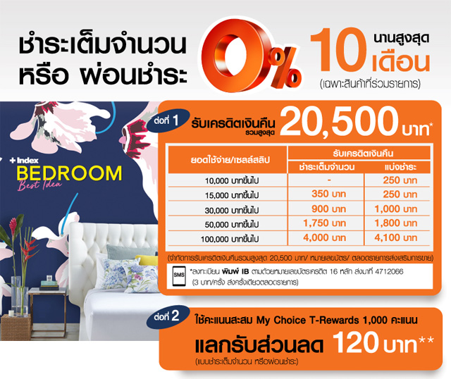 รายละเอียดโปรโมชั่น : ชำระเต็มจำนวน หรือ ผ่อนชำระ 0% นานสูงสุด 10 เดือน พร้อมรับ 2 ต่อ ที่ Index Living Mall