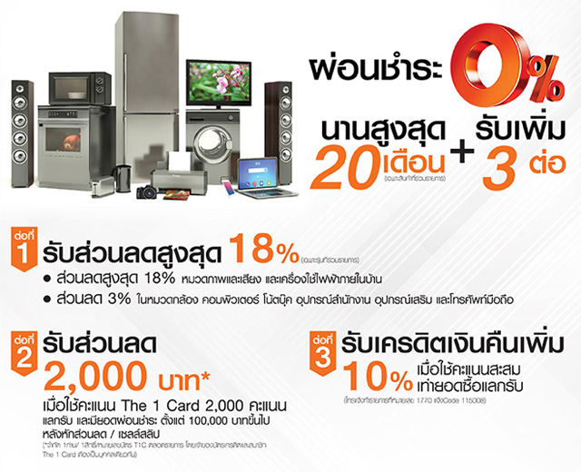 - ส่วนลด 3% ในหมวดกล้อง คอมพิวเตอร์ โน้ตบุ๊ค อุปกรณ์สำนักงาน อุปกรณ์เสริม และโทรศัพท์มือถือ - ต่อที่ 2 รับส่วนลด 2,000 บาท เมื่อใช้คะแนน The 1 Card 2,000 คะแนน แลกรับ และมียอดผ่อนชำระ ตั้งแต่ 100,000 บาทขึ้นไป/ เซลล์สลิป