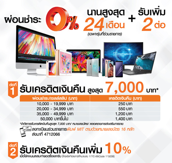 รายละเอียดโปรโมชั่น : ผ่อนชำระ 0% นานสูงสุด 24 เดือน พร้อมรับเพิ่ม 2 ต่อ ที่ร้าน Studio 7 และ BaNANA IT