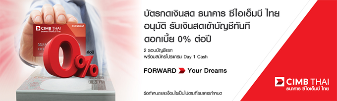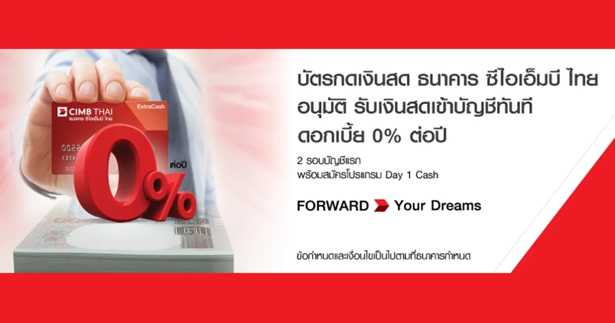 บัตรกดเงินสด ธนาคาร ซีไอเอ็มบี ไทย อนุมัติรับเงินสดเข้าบัญชีทันที ดอกเบี้ย 0% ต่อปี