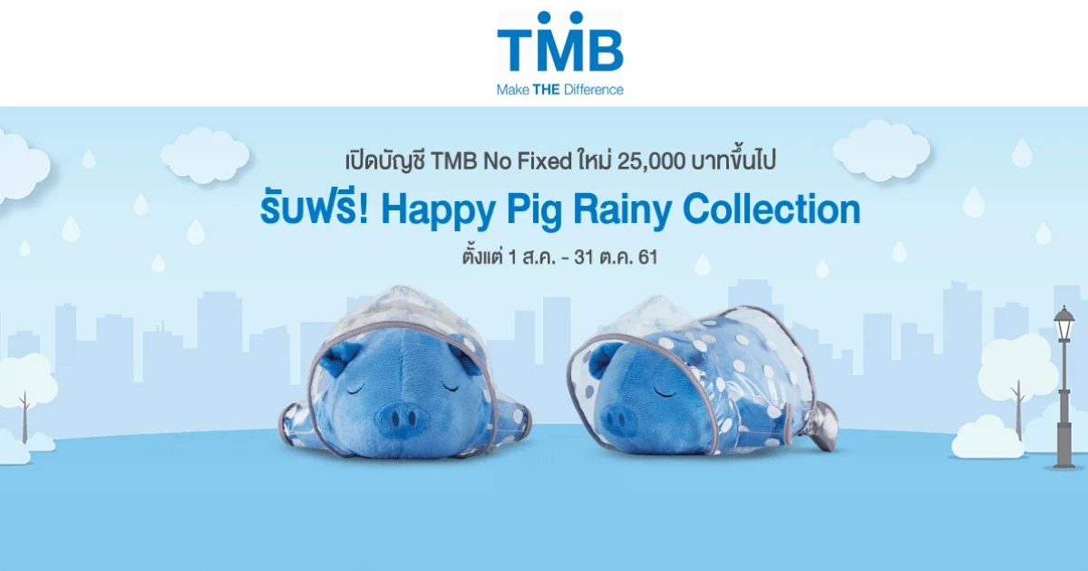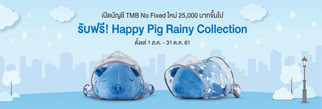 โปรโมชั่นใหม่จากธนาคารทหารไทย...ลูกค้าใหม่ที่เปิดบัญชี TMB No Fixed ตั้งแต่ 25,000 บาทขึ้นไป รับฟรี! Happy Pig Rainy Collection จำนวน 1 ตัว มูลค่า 250 บาท