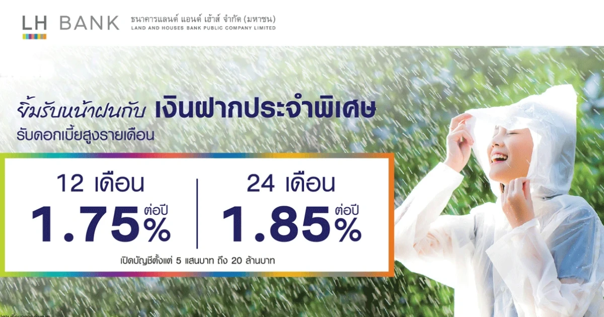 ยิ้มรับหน้าฝนกับแคมเปญบัญชีเงินฝากประจำพิเศษ ระยะเวลาฝาก 12 เดือน และ 24 เดือน รับดอกเบี้ยสูง จ่ายดอกเบี้ยรายเดือน โดยธนาคารจะนำดอกเบี้ยหลังหักภาษี ณ ที่จ่ายเข้าบัญชีออมทรัพย์อัตโนมัติ