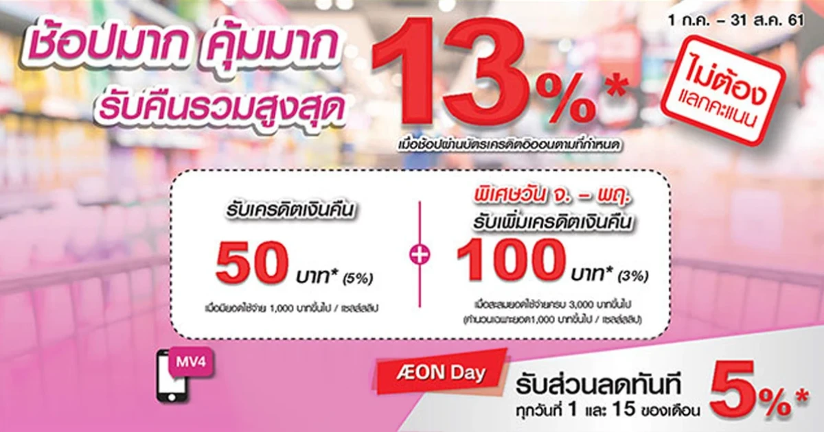 - รับเพิ่ม เครดิตเงินคืน 100 บาท เมื่อสะสมยอดใช้จ่ายครบ 3,000 บาทขึ้นไป ในวันจันทร์ - พฤหัสบดี (ขั้นต่ำ 1,000 บาทขึ้นไป/ เซลส์สลิป) - รับส่วนลด 5% AEON Day ทุกวันที่ 1 และ 15 ของเดือน เมื่อชำระค่าสินค้าผ่านบัตรเครดิตอิออน รอยัล ออร์คิด พลัส เวิลด์ มาสเตอร์การ์ด, บัตรเครดิตอิออน รอยัล ออร์คิด พลัส แพลทินัม, บัตรเครดิตอิออนโกลด์, บัตรเครดิตอิออนคลาสสิค และบัตรเครดิตอิออนคลับไทยแลนด์