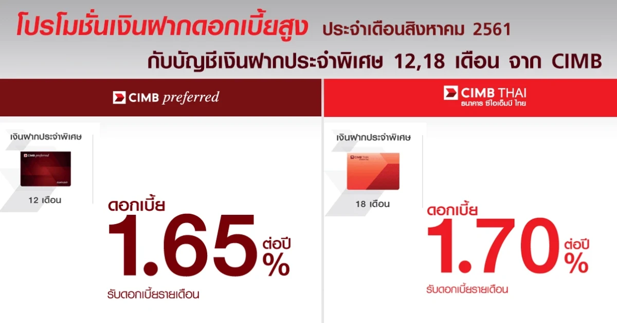 โปรโมชั่นบัญชีเงินฝากดอกเบี้ยสูงประจำเดือนสิงหาคม 2561 จาก ธนาคารซีไอเอ็มบี ไทย บัญชีเงินฝากประจำแบบมีกำหนดระยะเวลาที่ให้ดอกเบี้ยสูง และสามารถเลือกรับดอกเบี้ยแบบรายเดือน หรือเมื่อครบกำหนดได้