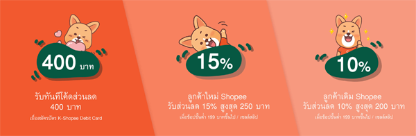 - รับทันทีโค้ดส่วนลด 400 บาท เมื่อสมัครบัตร K-Shopee Debit Card