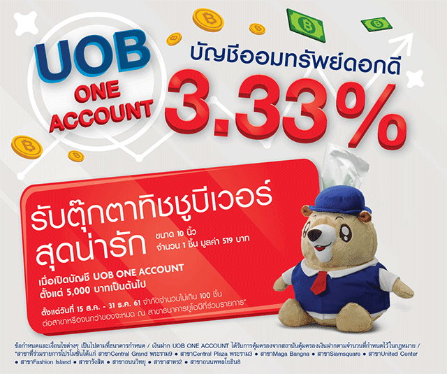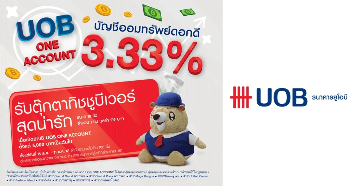 เปิดบัญชี UOB ONE ACCOUNT บัญชีออมทรัพย์ดอกเบี้ยดี รับดอกเบี้ยสูง 3.33% ต่อปี พิเศษ! รับตุ๊กตาทิชชู่บีเวอร์ สุดน่ารัก ขนาด 10 นิ้ว จำนวน 1 ตัว มูลค่า 519 บาท เมื่อเปิดบัญชีตั้งแต่ 5,000 บาทเป็นต้นไป ที่สาขาที่ร่วมรายการ