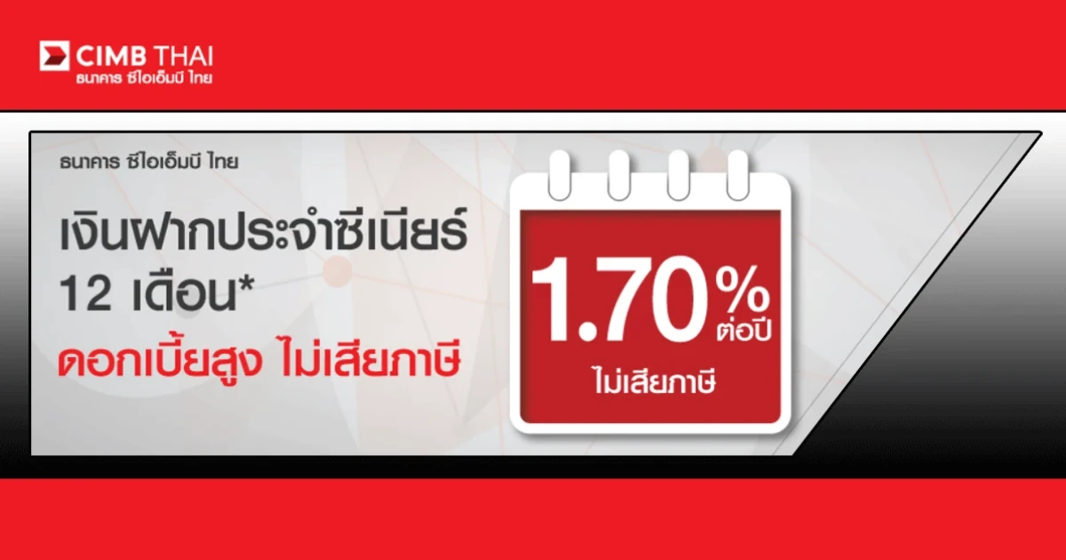 โปรโมชั่นบัญชีเงินฝากประจำซีเนียร์ 12 เดือน* จากธนาคารซีไอเอ็มบี ไทย สำหรับลูกค้าบุคคลธรรมดาที่มีอายุตั้งแต่ 55 ปีบริบูรณ์ขึ้นไป ณ วันที่เปิดบัญชี ให้ดอกเบี้ยสูง และไม่เสียภาษี