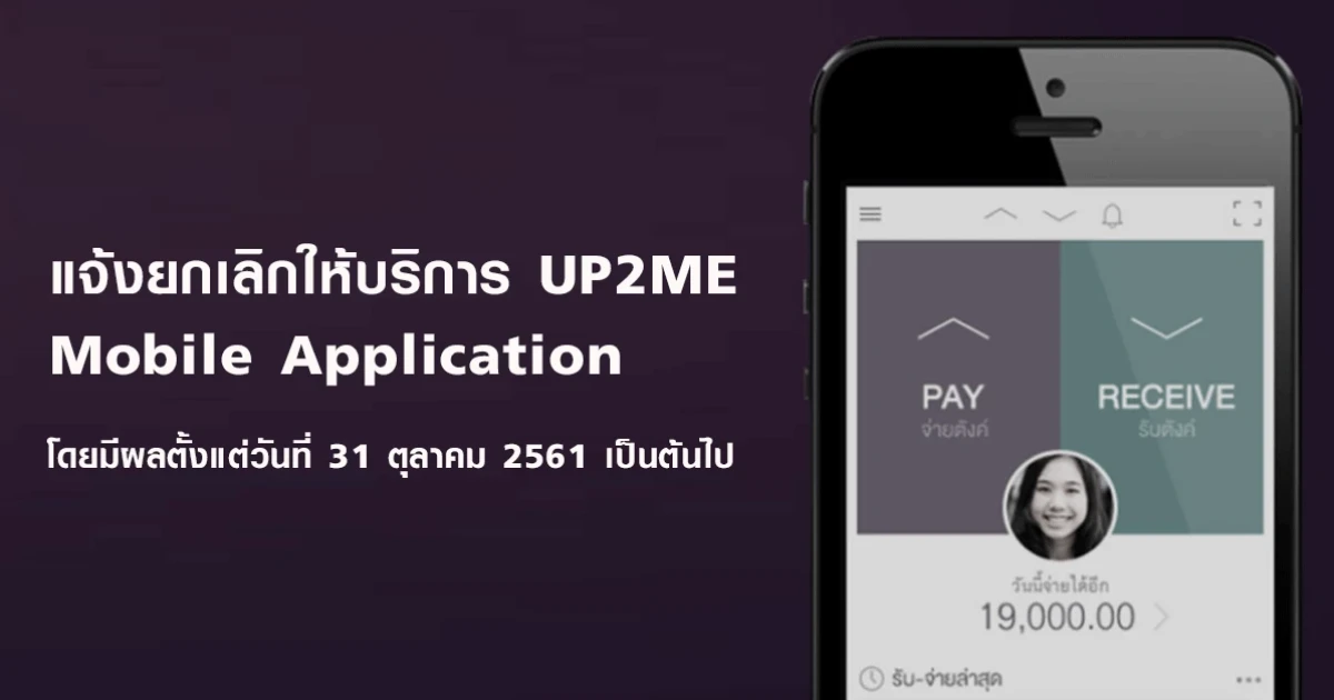 ธนาคารประกาศยกเลิกบริการผลิตภัณฑ์ UP2ME Mobile Application โดยมีผลตั้งแต่วันที่ 31 ตุลาคม 2561 เป็นต้นไป หากลูกค้ามีเงินคงเหลือใน e-wallet ใน UP2ME Mobile Application ระหว่างนี้ สามารถนำเงินออกจาก e-wallet ได้ตามปกติ
