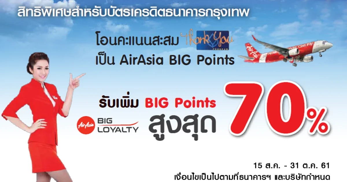 โอนคะแนนเป็น AirAsia BIG POINT รับเพิ่ม BIG POINT สูงสุด 70% สิทธิพิเศษ จากบัตรเครดิต ธ.กรุงเทพ