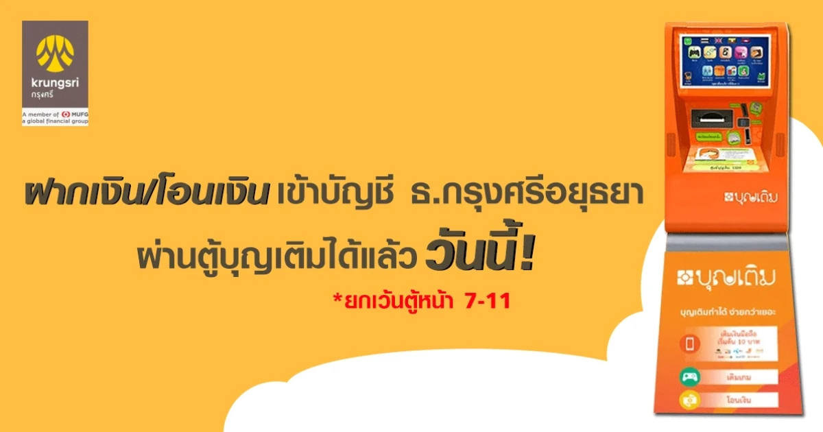 เริ่มแล้ว ลูกค้าบัญชีเงินฝากธนาคารกรุงศรีอยุธยา สามารถฝากเงิน/โอนเงิน ผ่านตู้บุญเติมได้แล้ว (ได้เงินทันที)