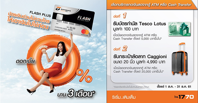 FLASH PLUS บัตรเงินด่วนไม่กวนใคร ให้เอาเงินไปใช้ก่อน ดอกเบี้ย 0% นาน 3 เดือน เมื่อเลือกใช้บริการโอนเงินผ่อนสบาย (Sabai Cash) และเลือกระยะเวลาผ่อนชำระ 24, 36, 48, 60 งวด