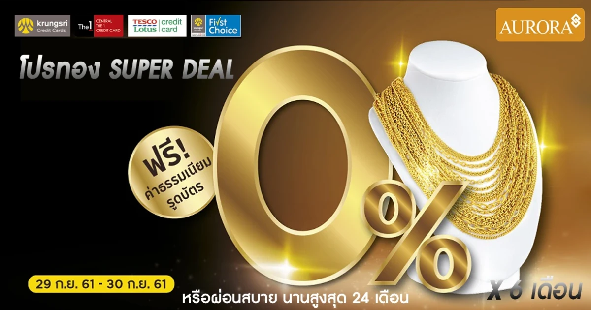สุดยอดดีล!! ผ่อนทองคำ 0% นาน 6 เดือน ฟรีค่าธรรมเนียมรูดบัตร หรือผ่อนสบายๆ นานสูงสุด 24 เดือน ที่ห้างเพชรทอง Aurora ทุกสาขาทั่วประเทศ จากบัตรเครดิตกรุงศรีเฟิร์สช้อยส์
