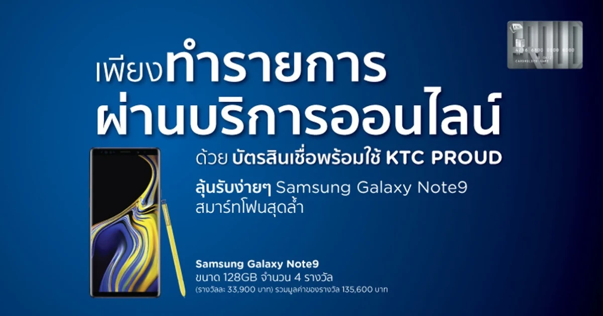 เพียงทำรายการผ่านบริการออนไลน์ ด้วยบัตรสินเชื่อพร้อมใช้ KTC PROUD ลุ้นรับง่ายๆ Samsung Galaxy Note9 ขนาด 128GB จำนวน 4 รางวัล (รางวัลละ 33,900 บาท) รวมมูลค่าของรางวัล 135,600 บาท