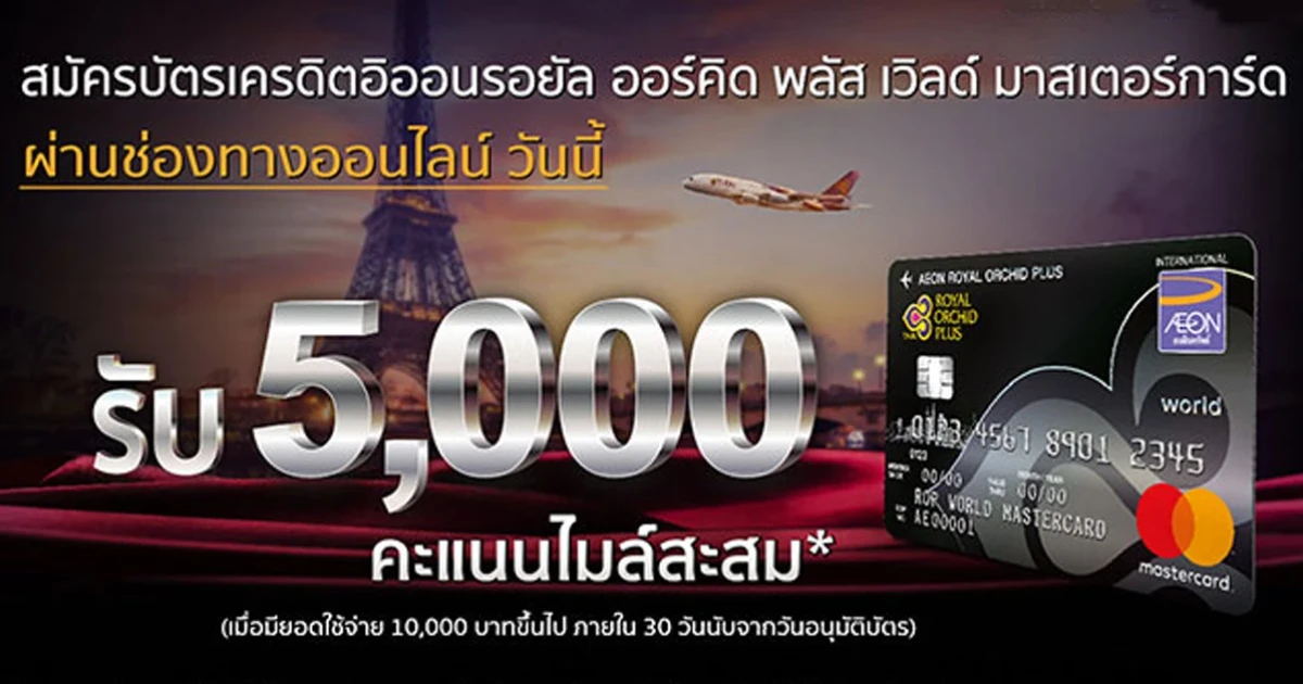 พิเศษ! สำหรับผู้สมัครบัตรเครดิตอิออน รอยัล ออร์คิด พลัส เวิลด์ มาสเตอร์การ์ด ผ่านช่องทางออนไลน์วันนี้ รับ! 5,000 คะแนนไมล์สะสม เมื่อมียอดใช้จ่าย 10,000 บาทขึ้นไป ภายใน 30 วัน นับจากวันอนุมัติบัตร