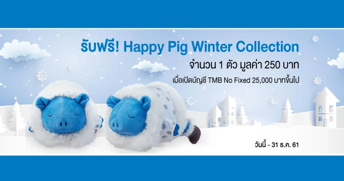 โปรโมชั่นใหม่จากธนาคารทหารไทย...ลูกค้าใหม่ที่เปิดบัญชี TMB No Fixed ตั้งแต่ 25,000 บาทขึ้นไป รับฟรี! Happy Pig Winter Collection จำนวน 1 ตัว มูลค่า 250 บาท